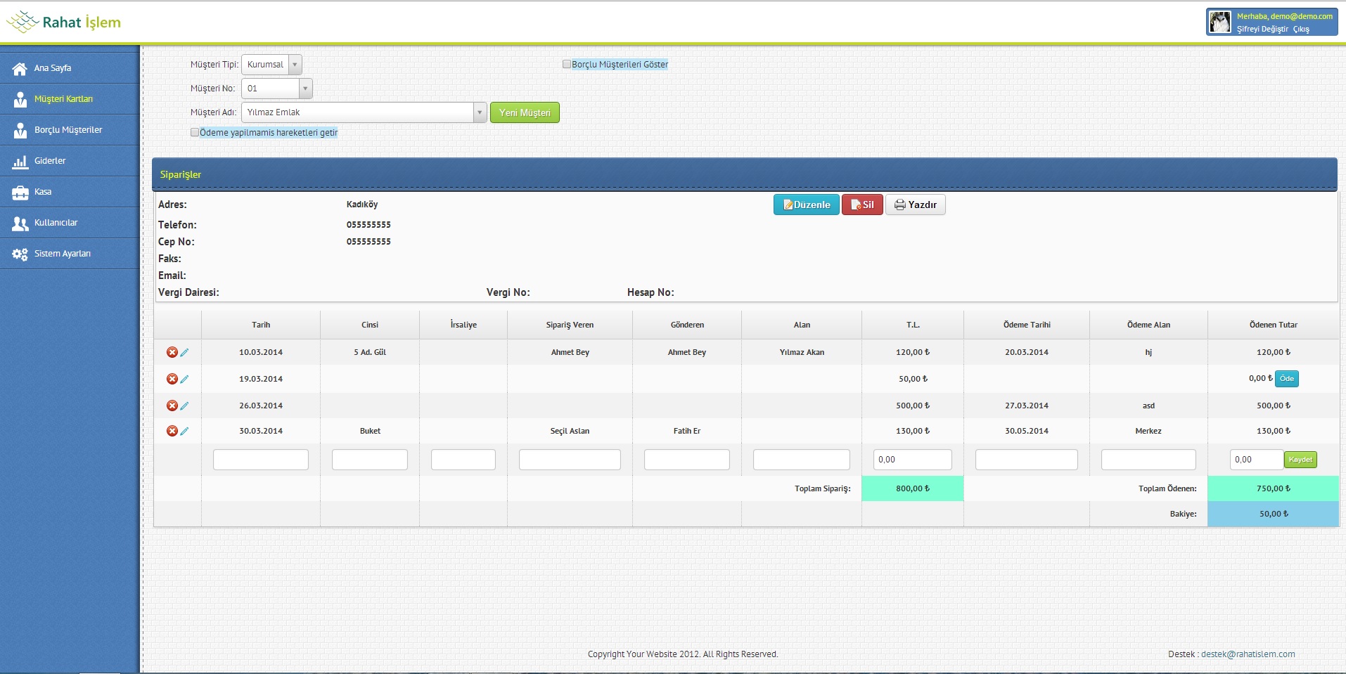 Sınırsız müşteri kayıt özelliği ile her bir müşterinin siparişlerini özel olarak girebilirsiniz . Müşteri bilgilerini tutarak , her müşterinin hesaplarını görebilirsiniz.