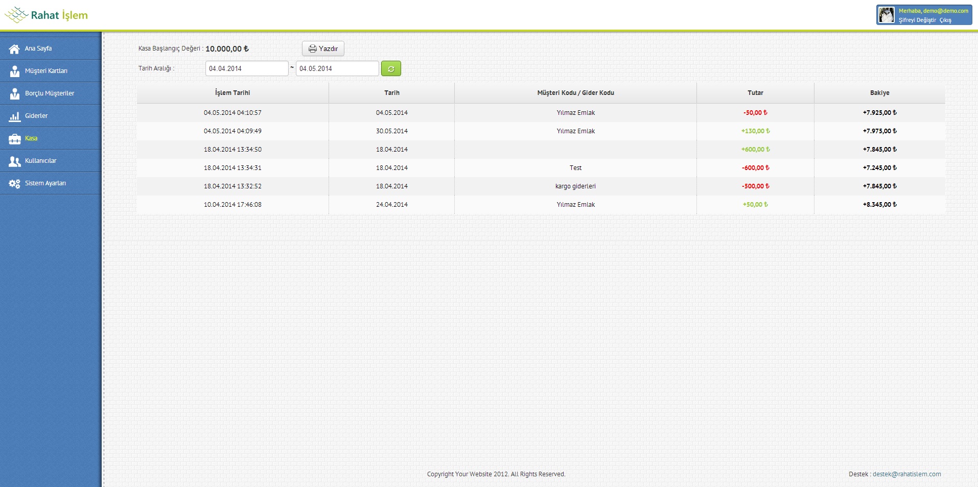 Müşteri hesap özetini çıkartabilirsiniz. Çıkartılan hesap özetine şirket logosu ile çıktı kağıdını birer belge olarak alabilirsiniz. Çıktıda tutar miktarı ve tarih bilgilerini görerek kolayca işlerinizi görebilirsiniz. Aynı zamanda kasada ki miktarınızı görmenizin yanı sıra, nakit akışı ve çıktılarını da görebilirsiniz.